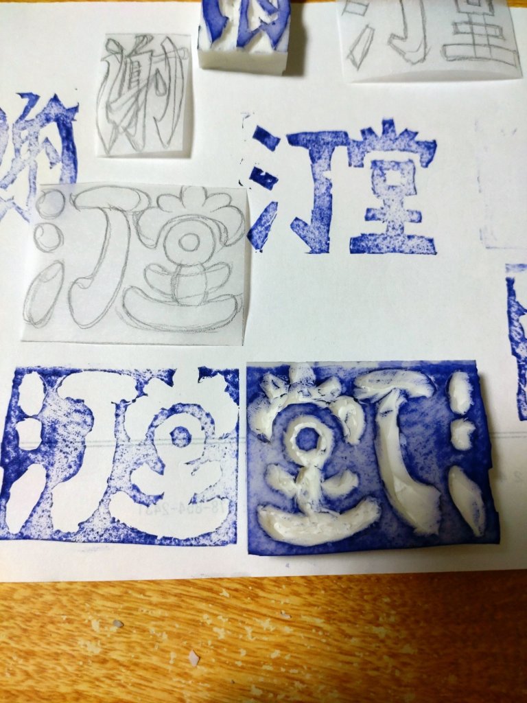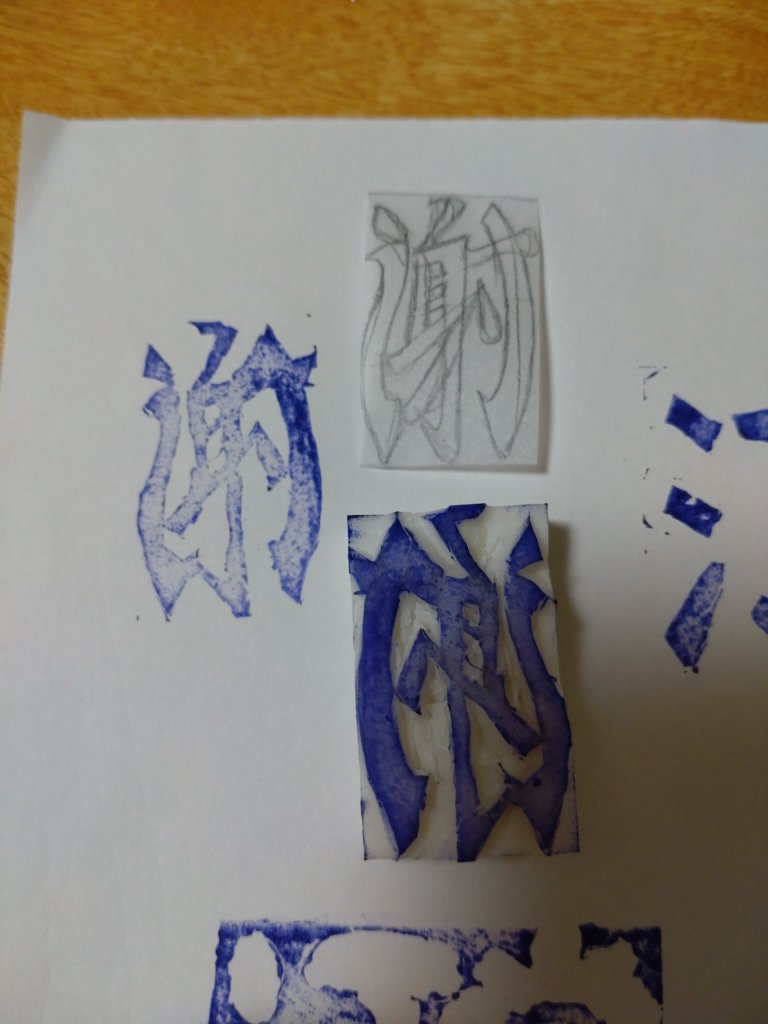 感謝の謝も彫ってみたが、画数多いからもちろんおかしい……あ、1画足りん(笑)