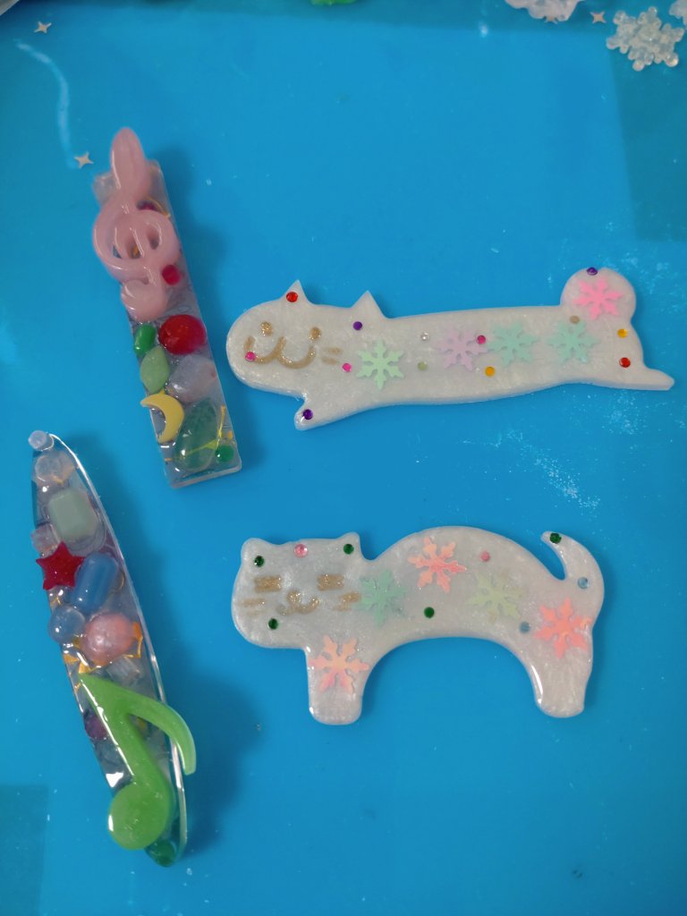 というわけでにゃんこと音符記号のヘアピン2つずつ。