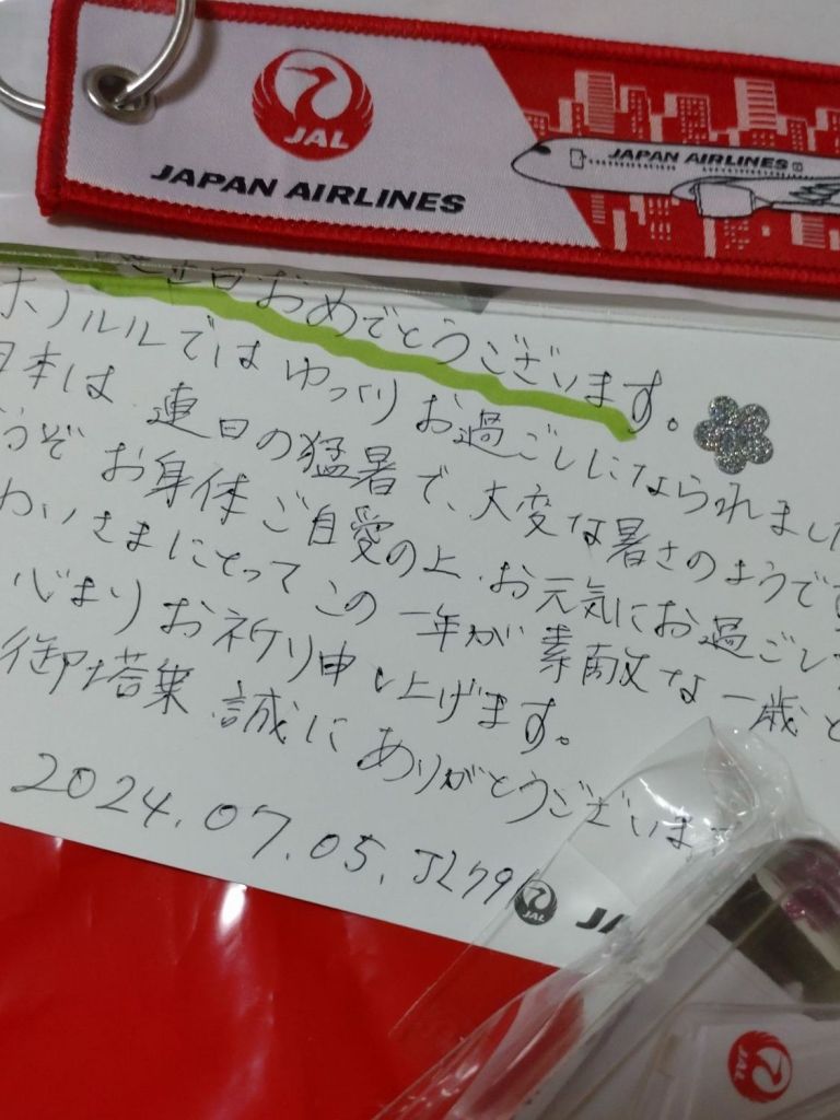 JALで降りる間際、CAさんが「お誕生日おめでとうございます」とプレゼントをくれた!乗ったのは誕生日の翌日、日本時間では二日過ぎてたんだが(笑)心配りが嬉しいじゃないですか♥️